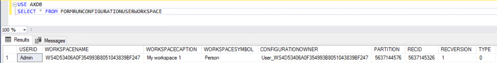 After investigating, The FORMRUNCONFIGURATIONUSERWORKSPACE table contains information about all customized workspaces configurations created by users. and some more useful methods like Loading /Deleting / Get and setting associated workspace configurations for specified user